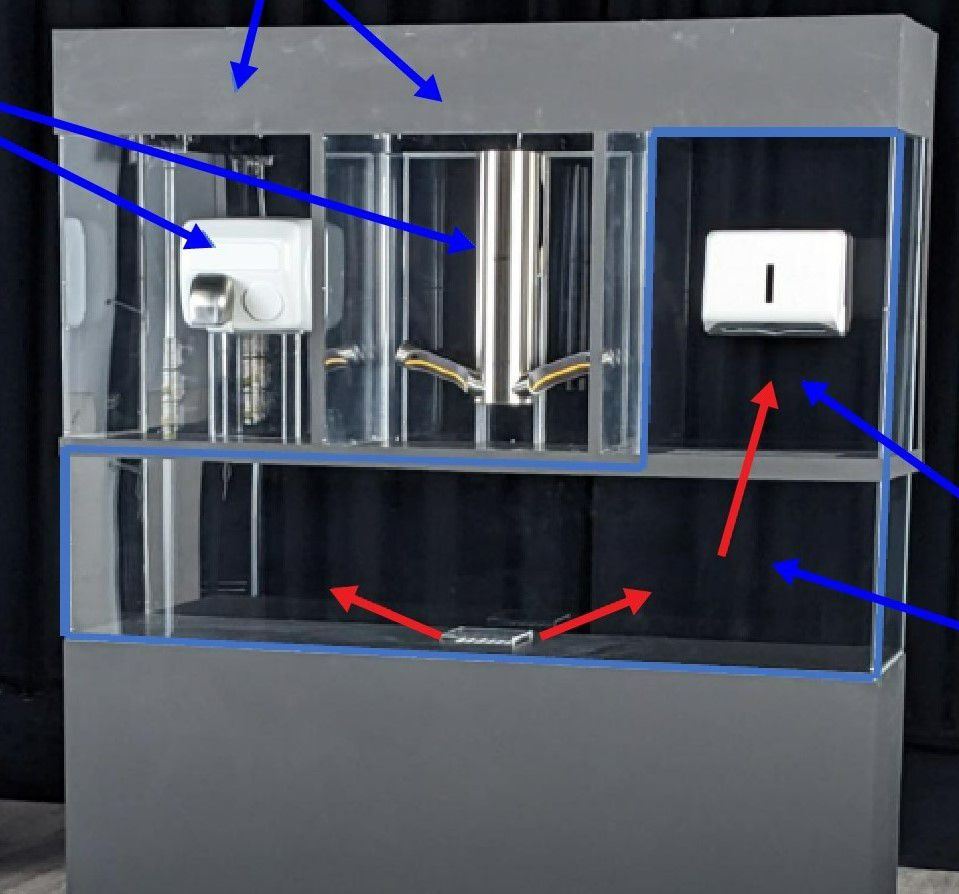 Zu Beginn der Demo "flutet" eine im Sockel versteckte Nebelmaschine die untere und die rechte Kammer mit Rauch. Dies stellt im Wesentlichen die Luftschadstoffe in einem Waschraum dar.